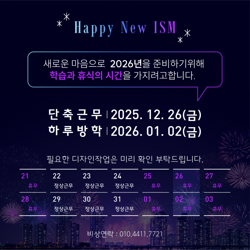 아래와 같이 연말·연초 근무 및 휴무 일정을 안내드립니다.